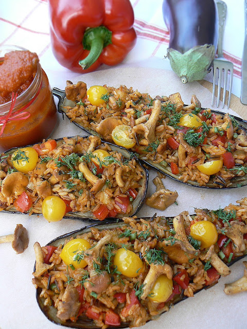 Pieczony bakłażan z pomidorowym ryżem i kurkami